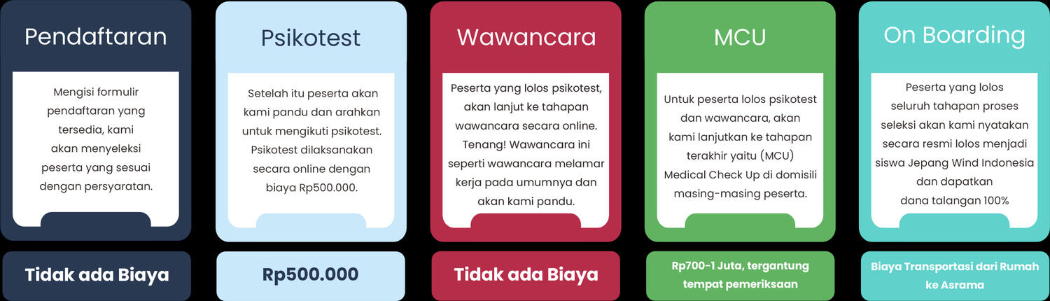 1. Form PendaftaranLangkah pertama adalah mengisi formulir pendaftaran yang tersedia. Pastikan untuk mengisi data dengan sebenar-benarnya dan menunjukkan komitmen yang serius. Kami akan menilai setiap pendaftar dan hanya mereka yang memiliki motivasi tinggi yang akan diterima untuk melanjutkan ke tahap berikutnya.2. PsikotestSetelah pendaftaran, kamu wajib mengikuti psikotest secara online. Admin kami akan memberikan panduan dan mempersiapkan kamu untuk kegiatan ini, termasuk soal-soal yang akan diujikan dan peraturan yang harus diikuti. Biaya untuk mengikuti psikotest adalah Rp500.000, yang sudah termasuk biaya pendaftaran. Hasil psikotest akan keluar dalam 1-3 hari setelahnya, dan hasil tersebut akan menentukan apakah kamu dapat melanjutkan ke tahap berikutnya.3. WawancaraJika kamu lulus psikotest, langkah selanjutnya adalah wawancara. Wawancara akan dilaksanakan secara online dan dilakukan dalam Bahasa Indonesia. Dalam wawancara ini, kamu akan ditanya tentang profil diri, pencapaian, pengalaman, serta komitmenmu untuk mengikuti program ini. Jika kamu berhasil melewati tahap ini, kamu akan melanjutkan ke tahapan terakhir, yaitu Medical Check Up (MCU).4. Medical Check Up (MCU)Tahapan terakhir yang harus dilakukan adalah MCU, yaitu pemeriksaan kesehatan. Kami telah menyesuaikan daftar item pemeriksaan sesuai dengan kebutuhan yang diminta oleh Imigrasi Jepang. Biaya untuk MCU berkisar antara Rp700.000 hingga Rp1.000.000. Pemeriksaan ini penting untuk pemantauan kesehatan selama pendidikan, dan hasilnya juga akan mempengaruhi kelayakanmu untuk mengikuti program. Kami akan meminimalisir risiko bagi peserta dengan riwayat penyakit berat, jadi pastikan untuk menjalani pemeriksaan ini dengan baik.