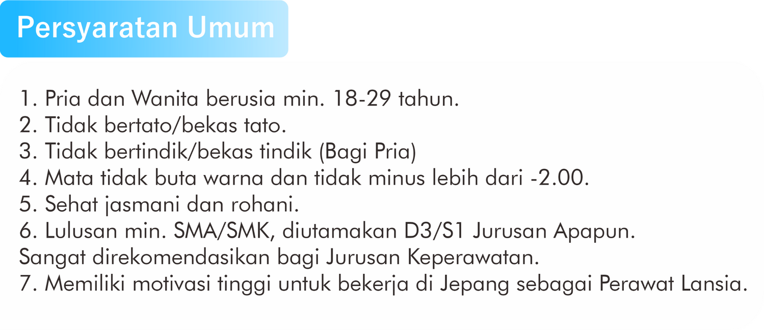 Untuk mengikuti program ini, Anda harus memenuhi beberapa persyaratan, yaitu:1. Sertifikat Bahasa Jepang: Siswa perlu memiliki sertifikat kemampuan bahasa Jepang di level JFT Basic A2 atau JLPT N4. Ini diperlukan untuk memiliki kemampuan komunikasi dasar yang diperlukan dalam lingkungan kerja.2. Sertifikat SSW Caregiver: