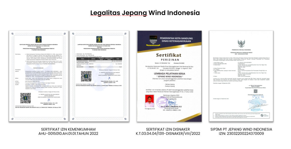 LPK Jepang Wind Indonesia telah resmi memiliki Izin SIP3MI dari Kementerian Ketenagakerjaan (KEMNAKER) Indonesia. Izin SIP3MI, atau Surat Izin Perusahaan Penempatan Pekerja Migran Indonesia, adalah lisensi yang dikeluarkan secara resmi oleh pemerintah melalui Menteri Ketenagakerjaan.Dengan izin ini, LPK Jepang Wind Indonesia diakui secara legal sebagai badan usaha berbadan hukum (perseroan terbatas) yang memiliki hak untuk menyelenggarakan layanan penempatan bagi Pekerja Migran Indonesia (PMI). Artinya, kami dapat membantu peserta untuk bekerja di luar negeri dengan sistem yang sesuai dengan peraturan pemerintah Indonesia, serta menjamin proses administrasi, pelatihan, dan penempatan PMI yang terstandarisasi dan aman.
