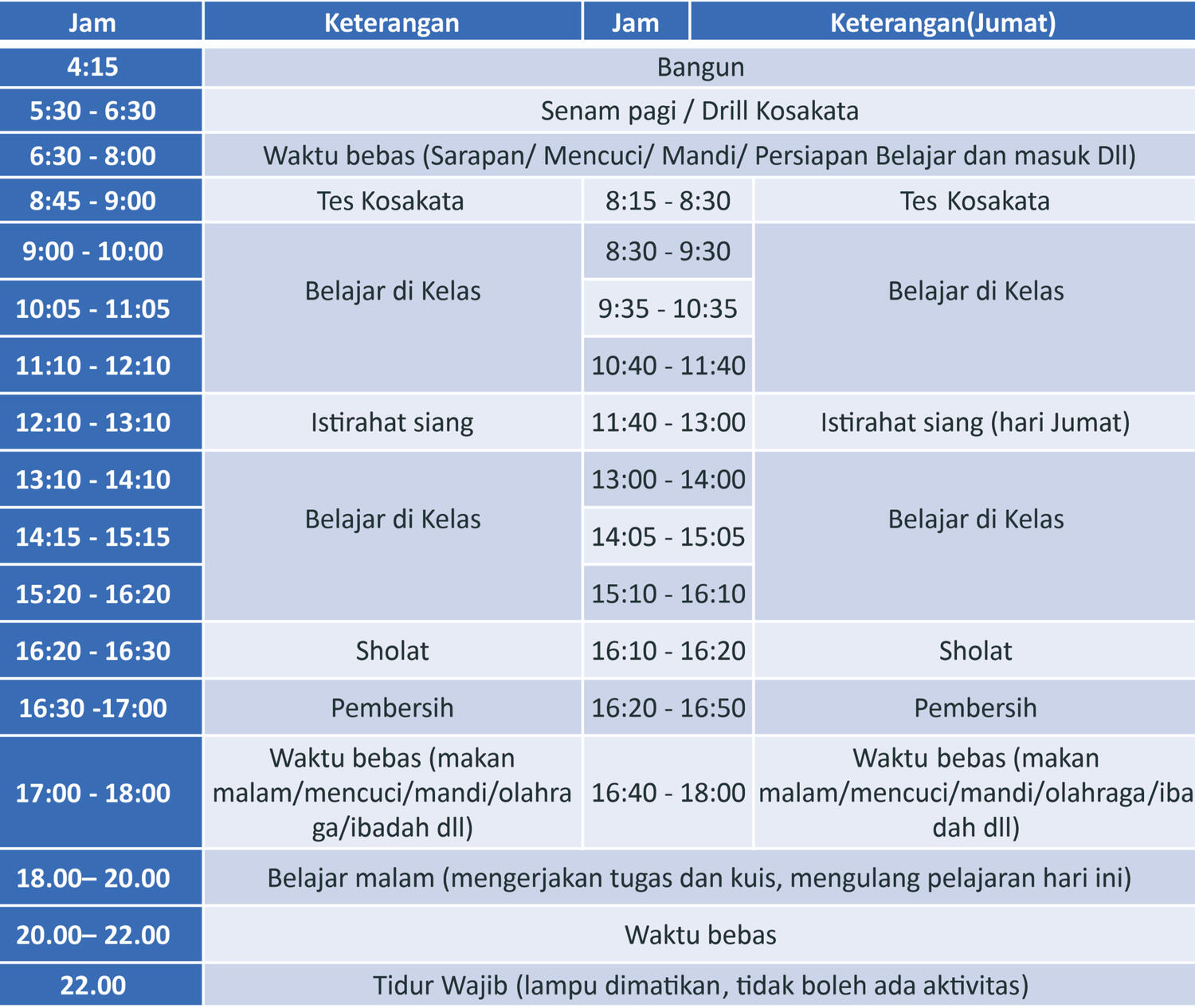 2. Jadwal PembelajaranKegiatan pembelajaran di J-Wind Indonesia berlangsung dari Senin hingga Jumat, mulai pukul 08.30 hingga 16.20. Setelah jam pembelajaran, siswa akan melakukan kegiatan shouji (bersih-bersih) sesuai jadwal piket.Setelahnya, siswa memiliki waktu bebas hingga pukul 18.00 dan akan melanjutkan belajar mandiri yang didampingi oleh sensei hingga pukul 20.00. Siswa dapat berkonsultasi mengenai materi pembelajaran yang sulit, memastikan bahwa mereka mendapatkan dukungan yang mereka butuhkan untuk berhasil.